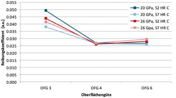 Abb. 51: Vergleich der Reibungskoeffizienten ungebürsteter Kolbenbolzen verschiedener Oberflächenqualitäten mit Schichthärten von 26 und 20 GPa; die absoluten Werte der Reibungskoeffizienten entsprechen dem Mittel aus den letzten zehn Minuten der Tribotests