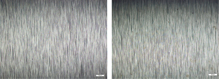 Abb. 52: Lichtmikroskopische Aufnahme der Oberfläche der ungebürsteten Kolbenbolzen; links: vor dem Tribotest, rechts: nach dem Tribotest; bei 100x Vergrößerung