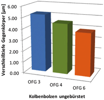 Im direkten Vergleich zu den tribologischen Systemen mit gebürsteten Kolbenbolzen zeigen die hier verwendeten Kolbenbolzen erhöhte Rpkx-Werte. Der entscheidende Grund für die höheren Werte ist auf die unzureichende Bürsteffizienz der in Serie verwendeten Bürstmaschine zurückzuführen. So nehmen diese tribolgischen Systeme bezüglich des Reibungs- und Verschleißverhaltens eine gesonderte Stellung zwischen den Systemen mit gebürsteten und ungebürsteten Kolbenbolzen ein. Die in Korrelation zum Verschleiß auftretende Gegenkörperglättung lässt auf ein ähnliches Einschleifverhalten wie bei den ungebürsteten Kolbenbolzen schließen, wobei die Verschleißintensität aufgrund der niedrigeren Rpkx-Werte (im Vergleich zu den ungebürsteten Kolbenbolzen) geringer ausfällt. In der Praxis war dieses Einlaufverhalten früher ein gewünschter Effekt, um die in Kontakt stehenden Bauteile optimal aneinander anzupassen. Heutzutage wird dieser Effekt durch den der Beschichtung folgenden Bürstprozess der Kolbenbolzen gänzlich ersetzt. Durch diesen Nachbearbeitungsprozess kann auch bei langen Lastzyklen unter Grenz- beziehungsweise Mischreibungsbedingungen, wie sie zum Beispiel bei Start-Stopp-Motoren häufig auftreten, die Verschleißintensität auf ein Minimum reduziert werden.