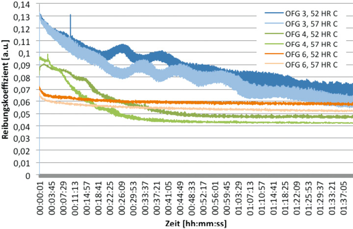 Weiterhin kann anhand der Kurven festgestellt werden, dass die Kolbenbolzen mit OFG 6 keine typische Einlaufphase zeigen, der Reibungskoeffizient allerdings höher als erwartet bei etwa 0,052 bis 0,058 liegt. Somit weisen die Kolbenbolzen mit OFG 4 den niedrigsten Reibungskoeffizienten auf, der abhängig von der Substrathärte in den letzten zehn Minuten der Tests zwischen 0,042 und 0,047 liegt. Die zu beobachtende Einlaufphase ist bei dieser Oberflächengüte nach etwa der Hälfte der Testdauer abgeschlossen und ändert sich ab hier nur noch geringfügig. Bei der OFG 3 ist eine deutlich länger anhaltende Einlaufphase zu erkennen und die Reibungskoeffizienten der unterschiedlichen Substrathärten liegen hier mit 0,060 und 0,068 relativ hoch.