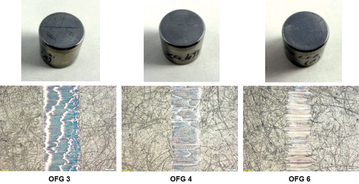 Abb. 53: Verschleißspur der 100Cr6-Gegenkörper für verschiedene Oberflächengüten der zugehörigen Kolbenbolzen; obere Reihe: Draufsicht der Gegenkörper, untere Reihe: lichtmikroskopischer Ausschnitt der Verschleißspur bei 100-facher Vergrößerung