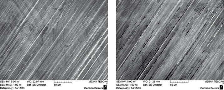 Abb. 61: Rasterelektronenmikroskopische Aufnahmen eines unbeschichteten Kolbenbolzen mit unbelasteter Stelle (links) und auf der Reibspur nach dem Tribotest (rechts); Anregungsspannung: 5 kV, 1000x Vergrößerung