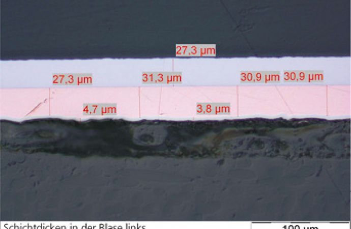 Die Poren in einer Nickel/Chrom-Schicht waren dagegen auf Einschlüsse zurückzuführen, die beim mechanischen Schleifen aus der Oberfläche gerissen worden waren und nicht mehr verschließbare Poren hinterließen. In einem Aluminiumsubstrat traten Poren auf, die durch vorhandene Bleieinschlüsse verursacht waren. Die chemisch abgeschiedene Nickelschicht konnte an diesen Stellen nicht ordnungsgemäß ablaufen und es entstanden Poren. In beiden Fällen musste das Grundmaterial geändert werden.