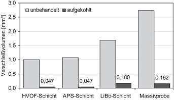Die deutliche Verbesserung im Verschleißwiderstand konnte auch beim Ball-on-Disk Test mit Al2O3-Gegenkörper bestätigt werden. Die besten Resultate lieferten die HVOF- und die APS-Schicht (Abb. 4). Insgesamt ist eine Reduzierung des volumetrischen Verschleißes von 60 % bis über 99 % im Vergleich zwischen unbehandelter und aufgekohlter Probe möglich.