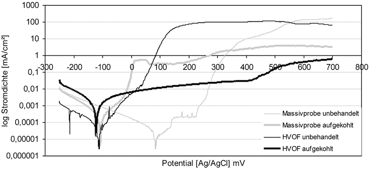 Darüber hinaus wurde das Passivierungsverhalten und die Neigung zur Lochkorrosion exemplarisch für HVOF-Schichten und Massivproben jeweils im aufgekohlten und unbehandelten Zustand durch Stromdichte-Potential-Messungen untersucht. Die entsprechenden Parameter sind in Tabelle 2 zusammengefasst.