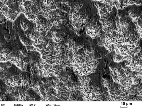 Anschließend wurde das Korrosionsverhalten der unbehandelten und aufgekohlten Proben exemplarisch für die HVOF-Schicht und den Massivwerkstoff charakterisiert. Dazu dienen Stromdichte-Potential-Messungen, welche das Passivierungsverhalten und die Lochkorrosion abhängig von Elektrolyt ermitteln. Die Korrosion wurde anschließend durch rasterelektronenmikroskopische Aufnahmen näher untersucht.