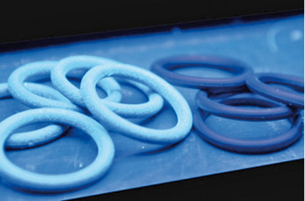 Abb. 4: O-Ringe links beschichtet mit Lack mit UV-Indikator, rechts unbeschichtet