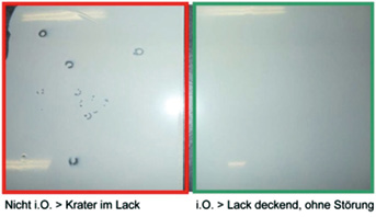 LABS-Freiheit wird über die Wirkung beziehungsweise die Effekte der Verschmutzungssubstanzen definiert. Die Prüfung ist relativ einfach, das Ergebnis kann aber interpretiert werden (Abb. 5). Die Prüfvorschriften beschreiben eindeutige Lackbenetzungsstörungen. Häufig werden aber auch Bläschenbildung, Verfärbungen oder Partikeleinschlüsse detektiert und als nicht LABS-frei erkannt.