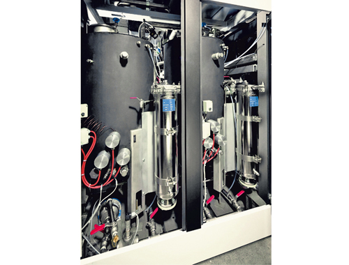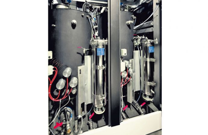 Die EcoCWave wird entsprechend den kundenspezifischen Anforderungen mit zwei oder drei Flutbehältern ausgestattet. Diese sind strömungsoptimiert rund gestaltet und stehend angeordnet. Im Gegensatz zu den tiefliegenden Rechteckbehältern von herkömmlichen wässrigen Reinigungsanlagen verhindern die runden Tanks die Bildung von Späne- und Schmutznestern. Dies ist eine Maßnahme, aus der die verbesserte Reinigungsqualität und eine längere Medienstandzeit resultieren. Hinzu kommt, dass jeder Tank über einen separaten Medienkreislauf mit Vollstromfiltration verfügt: Die Reinigungs- und Spülflüssigkeit wird beim Befüllen und Entleeren sowie im Bypass gefiltert. In das Kombinationsfiltergehäuse lassen sich sowohl Beutel- als auch Kerzenfilter einsetzen. Die Filtration kann dadurch schnell und ohne Umbauten an veränderte Sauberkeitsanforderungen angepasst werden.