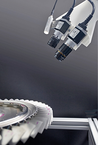 Text zum Titelbild: Prototypische Inspektion der Oberfläche einer BLISK (Bladed Integrated Disk) mit zwei Kameras und einer Beleuchtung (© Fraunhofer-ITWM)