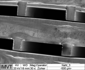 Für den Aufbau von mikrotechnischen Apparaten werden unter anderem strukturierte Bleche verwendet. Dr. Thomas Gietzelt vom KIT in Karlsruhe befasst sich mit dem Einsatz des Laser- und Diffusionsschweißens, um solche Bleche zu verbinden und die entsprechenden Apparate herzustellen. Beim Diffusionsschweißen werden die Ausgangsstrukturen in der Regel gestapelt und im Hochvakuum bis auf Temperaturen unterhalb des Schmelzpunkts aufgeheizt. Ein weiteres Verfahren ist das Laserschweißen, bei dem mittels Lichtleiter hohe Energien auf kleine Flächen fokussiert werden und somit hohe Schweißgeschwindigkeiten erreichbar sind. Kriterien für die Schweißqualität sind beispielsweise Gasdichtheit oder die Erhaltung der Geometrien der Teile. An metallographischen Schliffen zeigte der Vortragende die entstehenden Verbindungen, die je nach Anwendung eine hohe Festigkeit oder gasdichte Bereiche aufweisen müssen. Die Strukturen selbst können aus mehreren Hundert Einzelblechen mit komplexen Strukturen bestehen.