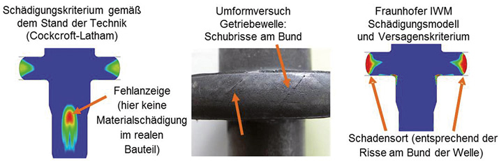 Verbesserung der Schadensvorhersage am Beispiel einer Getriebewelle: Schadensort im Umformexperiment (Mitte), inkorrekte Schadensvorhersage nach Stand der Technik (links) sowie die korrekte Schadensvorhersage (rechts) mit dem Fraunhofer IWM-Materialmodell (© Fraunhofer IWM)