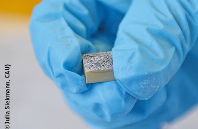 Text zum Titelbild: Als Vorarbeit werden unterschiedlich große Keramik- und Metallpartikel auf einen Kunststoff aufgebracht(©Julia Siekmann, CAU)