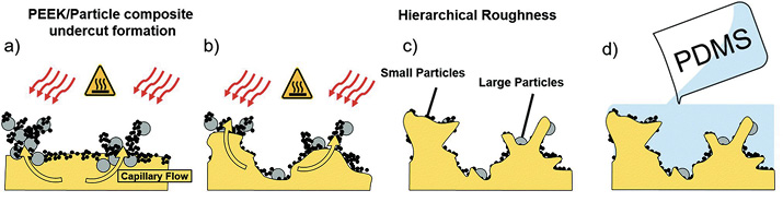 Um die beiden Kunststoffe PDMS und PEEK zu verbinden, machten sich die Wissenschaftlerinnen und Wissenschaftler den Kapillareffekt zunutze. Hierbei steigen Flüssigkeiten in engen Röhren oder Hohlräumen nach oben auf. Das Forschungsteam bestreute die glatte Oberfläche des PEEK-Polymers mit einem Puder aus herkömmlichen Keramikpartikeln verschiedener Größen. Durch Erwärmen saugten die Partikel den Kunststoff geradezu auf und verschmolzen zu einer extrem rauen Struktur voller Hohlräume. Anschließend gaben die Forschenden flüssiges PDMS auf die zerklüftete Oberfläche, das tief in die entstandenen Hohlräume eindrang. Das Entscheidende an unserer mechanischen Methode ist die unterschiedliche Größe der Partikel auf der Nano- und Mikroskala, so Siebert. So könne sich auch aus normalen runden Teilchen eine Hakenstruktur aufbauen, in die sich der weiche Kunststoff passgenau einfügen könne. In getrocknetem Zustand sei er damit fest verankert. Mit dieser als mechanisches Interlocking bezeichneten Methode erzielte das Forschungsteam eine wesentlich höhere Haftung als bei anderen Methoden, bei denen sich die Kunststoffe bereits nach geringer Belastung wieder voneinander lösten.