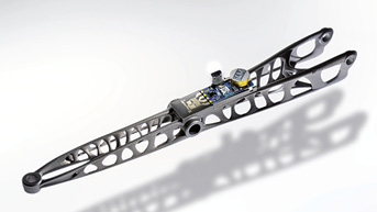 Der Pkw-Querlenker mit aufgedrucktem Kraftsensor liefert zu jedem beliebigen Zeitpunkt die im Einsatz wirkenden Kräfte und registriert kleinste Risse, die auftreten, bevor ein Defekt entsteht (© Fraunhofer ILT, Aachen)