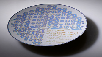 Auf den Wafer lassen sich durch Inkjet-Druck technische Strukturen und beliebige Geometrien auftragen. Danach werden die Lautsprecherelemente vereinzelt und in eine elektronische Umgebung eingebunden (© Fraunhofer ILT, Aachen)