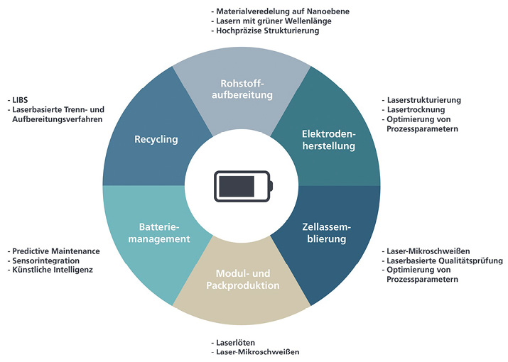Die Batterieproduktion steht im Zentrum der Elektromobilitätswende und damit im Fokus von Innovationen, die Effizienz, Nachhaltigkeit und technologische Spitzenleistungen vereinen. Die vorgestellten Technologien und Entwicklungen entlang der Produktionskette zeigen, wie modernste Laserverfahren den Weg zu einer nachhaltigen und wettbewerbsfähigen Batterieindustrie ebnen können – von der Rohstoffaufbereitung über die Elektrodenherstellung bis zur Zellassemblierung und dem Recycling. Gleichzeitig schaffen KI-gestützte Analyse- und Steuerungssysteme eine neue Dimension der Prozesskontrolle, die Produktionsqualität und Nachhaltigkeit verbessert und die Produktionskosten weiter zu senken.