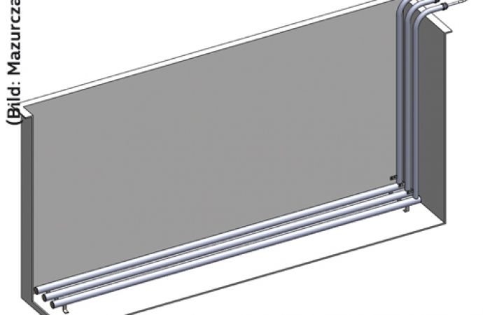 Insgesamt drei Stück Heizregister mit jeweils 18 kW realisieren eine Gesamtleistung von 54 kW (Abb. 4). Die Länge der beiden horizontalen Tauchrohre beträgt 2350 mm. Bei einer Brünierung ist mit einem flächigen Abtrag der Wanddicke zu rechnen. Es werden hier Rohre aus Stahl S355J2H mit einer großen Wanddicke eingesetzt.
