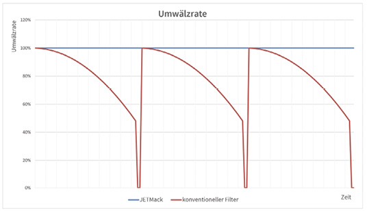 Bei konventioneller Filterung von Galvanikelektrolyten sinkt die Umwälzrate durch die Filterbelegung, was beim JETMack nicht der Fall ist