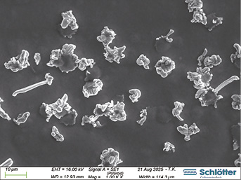 Labortest ist das eine, aber die wirkliche Bewährung einer Anlage kommt in der harten Praxis des Beschichtungsalltags – und hier kam der Dritte im Bunde hinzu: Walter Doll von der Grau & Wagenblast Metallveredelung in Untergröningen. Er hatte zeitweise mit dem Problem von störenden Partikeln im Elektrolyten bei der Abscheidung von Zink aus seinem alkalischen Elektrolyten zu kämpfen. Die Schichten entsprachen nicht den hohen Ansprüchen von Walter Doll, der seinen Kunden nur Oberflächen in höchster Qualität liefern möchte. Anhand von REM Untersuchungen konnte eine Zinkwhiskerbildung als Ursache ausgemacht werden. Die Whisker traten nach Wärmeauslagerung und nach längerer Lagerzeit beim Endkunden auf. Besonders negativ ist die reduzierte Korrosionsbeständigkeit der Zinküberzüge aufgefallen.