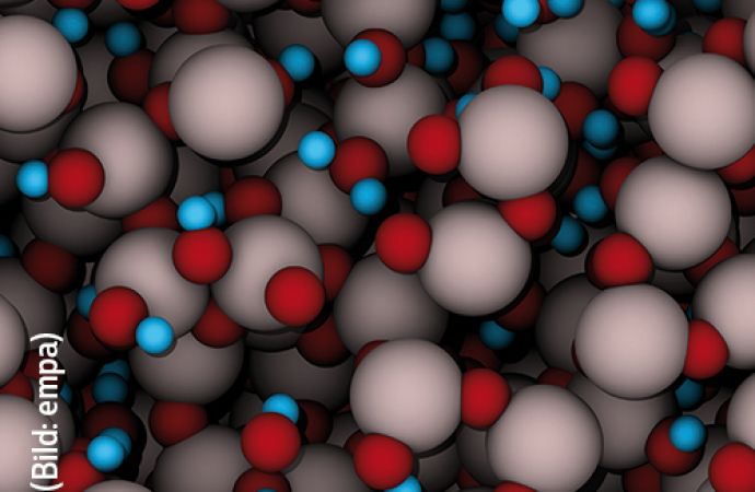 Text zum Titelbild: Klarheit aus dem Chaos – Die Aluminiumatome (grau) und die Sauerstoffatome (rot) liegen im amorphen Aluminiumoxid nicht in einer geordneten kristallinen Form vor. Das Modell zeigt außerdem eingelagerte Wasserstoffatome (blau), die sich an den Sauerstoff binden und so die Materialeigenschaften des Aluminiumoxids entscheidend verändern (Bild: Empa)