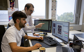 Empa-Forschenden unter der Leitung von Simon Gramatte (vorne) und Vladyslav Turlo ist es erstmals gelungen, amorphes Aluminiumoxid mit Wasserstoffeinschlüssen atomar genau zu simulieren (Bild: Empa)
