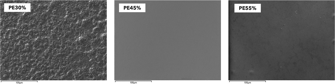 REM-Aufnahmen der Beschichtungen mit Cutin im semikristallinen (links) sowie im amorphen Zustand (Mitte und rechts) auf Stahl (Bild: Dr. Buratti)
