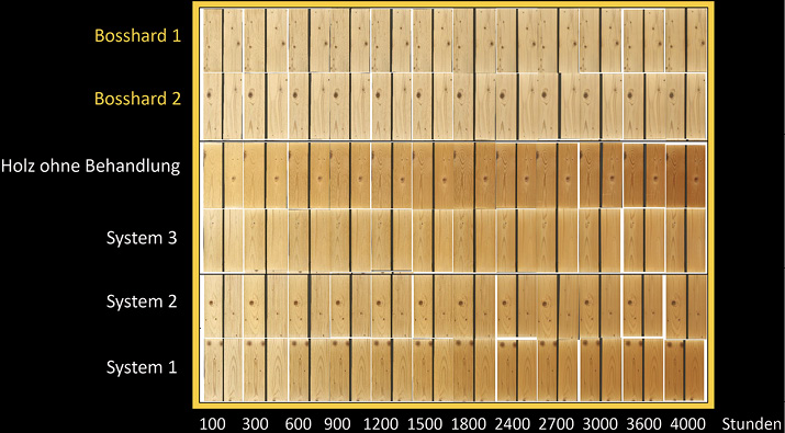 Kriterien für die Beschichtung sind den Untersuchungen von Dr. Starovicova zufolge vor allem die Farbkonstanz, Benetzbarkeit in Richtung superhydrophob, das Diffusionsverhalten sowie die Feuchteregulierung. Die Untersuchungen über einen Zeitraum von etwa drei Jahren belegen, dass zwei Systeme von Bossard extrem stabiles Aussehen erzeugen, das heißt, es treten kaum erkennbare Farbveränderungen auf. Die Beschichtungen mit Dicken im Bereich von etwa 30 µm bis 60 µm zeigen ein nahezu superhydrophobes Verhalten. Beim Parameter Diffusion von Feuchtigkeit ist eine langsame Ausdunstung von Vorteil, da sich das Holz in diesem Falle an die Änderungen anpassen kann und damit keine Risse entstehen. Die von Bossard entwickelten Beschichtungssysteme gewährleisten ein langfristig gleiches Aussehen von Holzelementen. Dabei kommen nicht nur Nadelhölzer zur Anwendung, sondern auch die stabilere Buche.