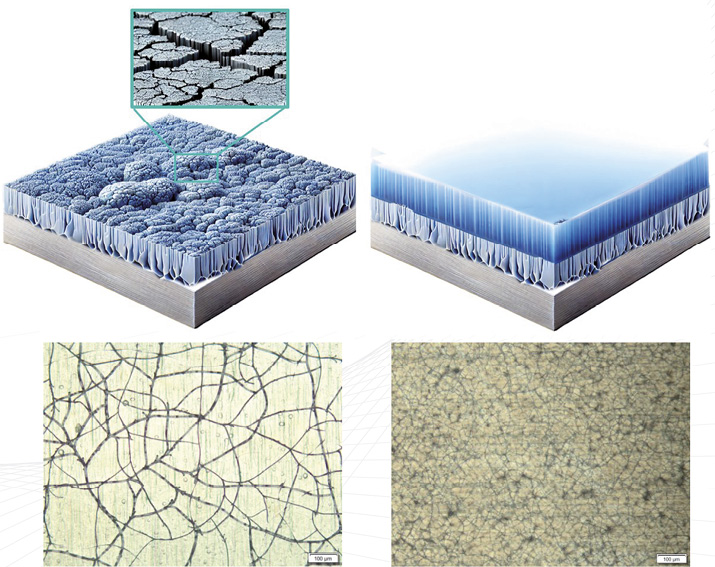 Galvanisch abgeschiedene Chromschichten eignen sich zur Aufnahme von Gleitwerkstoffen, wobei das Rissnetzwerk in unterschiedlicher Ausdehnung gestaltet werden kann (Bild: Dr. Massler)