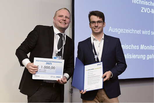 Für besondere Leistungen auf dem Gebiet der Galvano- und Oberflächentechnik verleiht die DGO an Studenten und Auszubildende den DGO-Nachwuchsförderpreis. In diesem Jahr wurde Fabian Pantleon von der Technischen Universität Ilmenau für seine Arbeit zum elektrochemischen Monitoring des Beizvorgangs auf dem Weg zur Digitalisierung galvanotechnischer Prozessschritte ausgezeichnet. Die Urkunde mit einem Scheck über 1000,- Euro wurde durch Dr. Klaus Wojczykowski, Leiter des DGO-