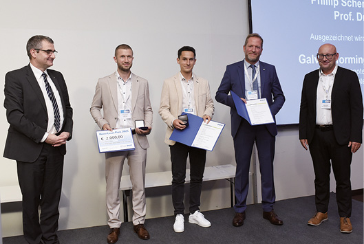 Der Heinz-Leuze-Preis für besonders gelungene Veröffentlichungen in deutschsprachigen Fachmedien ging an das Autorentrio Phillip Scherzl, Michael Kaupp und Prof. Dr. Timo Sörgel von der Hochschule Aalen für den zweiteiligen Aufsatz über Galvanoformung von Aluminiumfolien (erschienen in Galvanotechnik 2/2024 und 3/2024). Überreicht wurde der Preis, bestehend aus Medaille und Preisgeld, durch Prof. Dr. Andreas Bund von der TU Ilmenau.