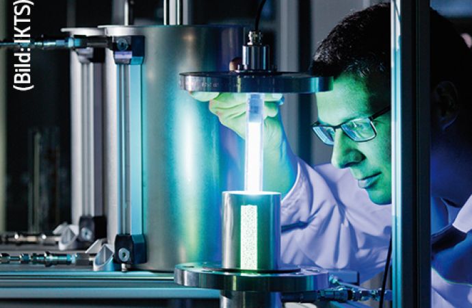Text zum Titelbild: Am Fraunhofer IKTS wird an der Entwicklung multifunktionaler Schaumkeramiken zur photokatalytischen Reinigung gearbeitet (© Fraunhofer IKTS)