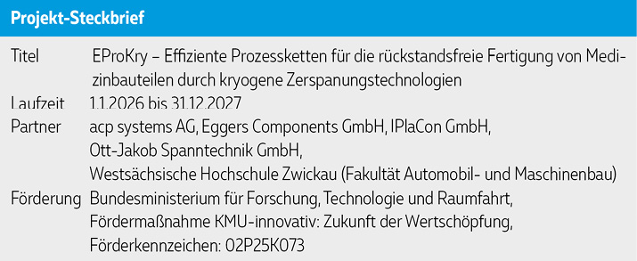 An der Fakultät Automobil- und Maschinenbau der Westsächsischen Hochschule Zwickau (WHZ) ist das Forschungsprojekt EProKry- Effiziente Prozessketten für die rückstandsfreie Fertigung von Medizinbauteilen durch kryogene Zerspanungstechnologien gestartet.