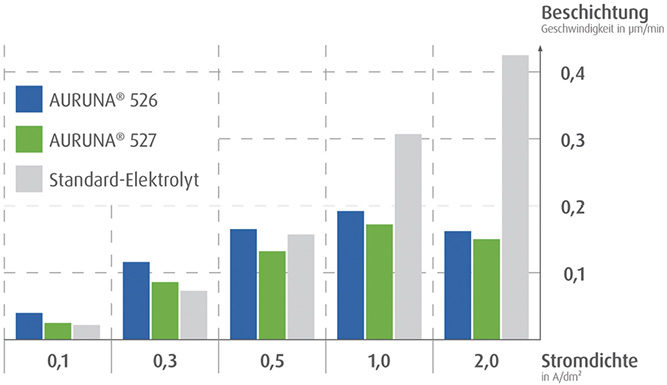 Wie von qualitativ hochwertigen Hartgoldelektrolyten gewohnt, sind die daraus abgeschiedenen Schichten abriebbeständig und erfüllen auch höchste Anforderungen an den Korrosionsschutz sowie geringe Übergangswiderstände für zuverlässige Kontaktanwendungen. So liegt der Kontaktübergangswiderstand in internen Messreihen für den Hartgoldelektrolyten AURUNA® 526 bei 3,33 mOhm beziehungsweise bei 3,26 mOhm für AURUNA® 527 (bei 50 cN) und damit im für Hartgoldschichten charakteristischen Bereich. Die beschichteten Komponenten können somit auch in anspruchsvollen Bereichen, wie der Verteidigungstechnik, eingesetzt werden, da sie die ASTM-Norm B 488-01, Typ I, Code C, erfüllen. Dies wird durch einen hohen Feingehalt von ~99,8 % und eine Härte von ~150 HV bedingt, die eine zuverlässige Funktionalität und Langlebigkeit gewährleisten.