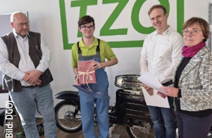 Am Beruflichen Schulzentrum für Bau- und Oberflächentechnik Zwickau hat im vergangenen Jahr Johannes Florek seine Ausbildung zum Oberflächenbeschichtung mit den besten Noten abgeschlossen, berichtet die Deutsche Gesellschaft für Galvano- und Oberflächentechnik e. V. (DGO). Dafür wurde er am 27. November 2025 in seinem Ausbildungsbetrieb, der TZO Leipzig GmbH, von Marion Regal als Vertreterin der DGO geehrt. Mit dabei waren auch der Geschäftsführer der TZO Leipzig, Dr. Thomas Krümmling, sowie die Vertreter der Schule Benjamin Trinks und Lutz Baumbach. Seitens der DGO wurde Florek mit einer Urkunde, einem Fachbuch, gesponsert vom Eugen G. Leuze Verlag, einem Gutschein für einen einjährigen kostenfreien Bezug des ZVOreports und der Zeitschrift Galvanotechnik sowie einer kostenfreien Nachwuchsmitgliedschaft bis zum 28. Geburtstag ausgezeichnet. Die TZO bedankte sich für seine Leistungen mit einem Geldgutschein.