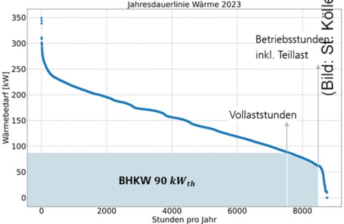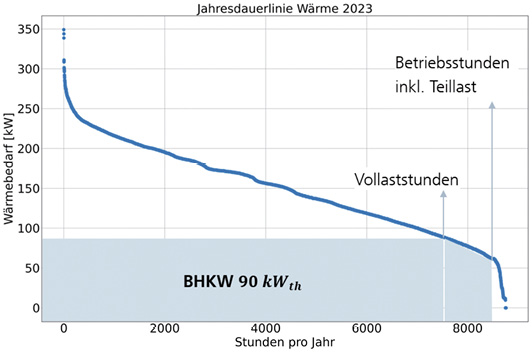 Basierend auf der Jahresdauerlinie kann die thermische Nennleistung des BHKW so festgelegt werden, dass die Anlage einen möglichst hohen Anteil der jährlichen Betriebsstunden abdeckt. Ziel bei der Auslegung war es, das BHKW hauptsächlich im Volllastbereich zu betreiben, um eine hohe Laufzeit und eine effiziente Nutzung von Strom und Wärme zu gewährleisten. Eine zu große Auslegung könnte zu häufigem Teillastbetrieb oder Stillstand führen, während eine zu kleine Auslegung den Eigenverbrauch der erzeugten Energie einschränken würde. Durch die grafische Analyse der Jahresdauerlinie wurde eine thermische Leistung von 90 kWth bestimmt, die einen durchgehenden Einsatz des BHKW über große Teile des Jahres ermöglicht (Abb. 9). Ein Teil der verbleibenden Betriebsstunden kann durch den Teillastbetrieb abgedeckt werden. So trägt das BHKW zur Wärmeversorgung bei; bei einem elektrischen Wirkungsgrad von 33 % werden etwa 50 kW elektrische Energie gekoppelt erzeugt. Dies führt zudem zu einer Verringerung des externen Strombezugs in den untersuchten Energiesystemvarianten.