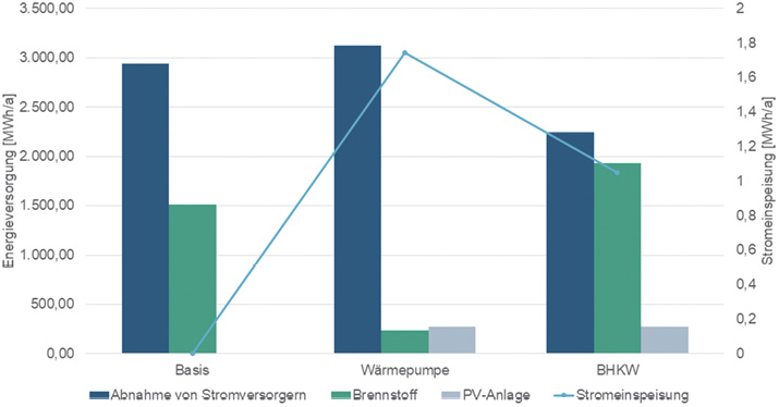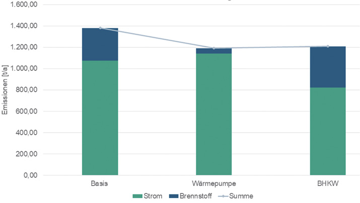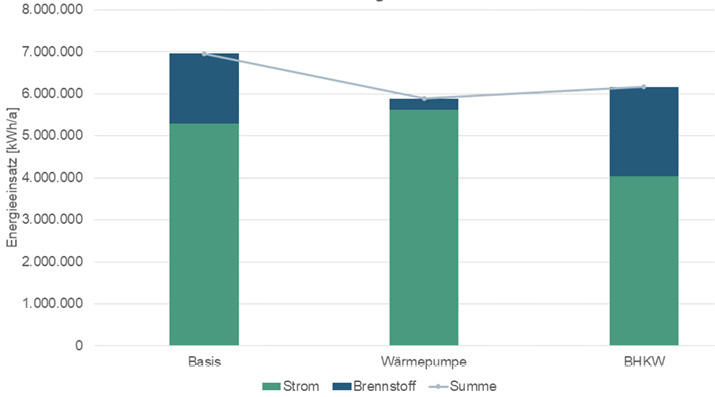 Die Ergebnisse der Variantensimulation sind (1) für die Einbindung einer Wärmepumpe mit 150 kW und (2) eines Blockheizkraftwerks (BHKW) mit einer Brennstoffnennleistung von 150 kW dargestellt, davon 90 kW thermisch und 50 kW elektrisch. Die Ergebnisse der Varianten werden mit denen der Basisvariante verglichen. Im Folgenden werden die wichtigsten Kennzahlen verglichen, um Unterschiede im Energieverbrauch, in den Treibhausgasemissionen und in der Wirtschaftlichkeit zu bewerten.