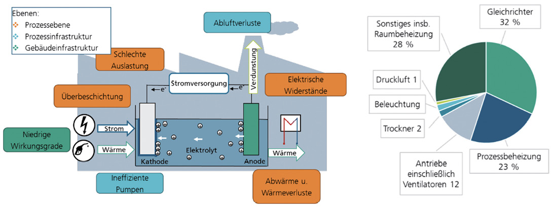 Abb. 2: Darstellung typischer Bereiche von Energieverlusten in galvanotechnischen Betrieben (links, eigene Darstellung) sowie prozentuale Verteilung des Energieverbrauchs in galvanotechnischen Betrieben (rechts) [11]