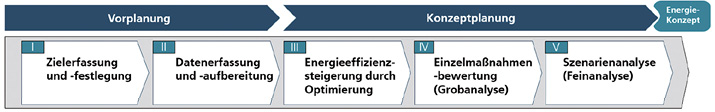 Als methodisches Vorgehen wird zunächst eine (1) Zieldefinition für das Energiesystem erstellt. Darauf aufbauend erfolgen die (2) Datenerfassung und -aufbereitung, um die aktuelle energetische Situation klar darzustellen. Dies umfasst die Ermittlung von Lastprofilen sowie die Identifikation der Hauptenergieverbraucher. Basierend auf diesen Daten werden (3) Maßnahmen zur Energieeinsparung im Rahmen von Energieeffizienzinitiativen bewertet. Anschließend werden (4) einzelne Technologien und ihre Auslegung analysiert, um anschließend eine (5) Szenarioanalyse mit verschiedenen Technologiekombinationen durchzuführen und diese Varianten sowie den Vergleich der Technologiekonfigurationen zu bewerten [12]. Abbildung 3 stellt die genannten Schritte zur Energiesystemplanung dar, um ein zukunftsorientiertes Versorgungskonzept zu erstellen.