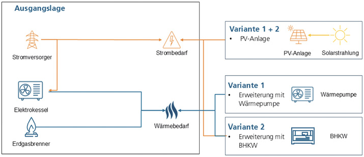 Zunächst wurde der aktuelle Energiebedarf des Betriebs für die Energiesystemplanung ermittelt, einschließlich des jährlichen Stromverbrauchs, des Wärmebedarfs sowie der elektrischen Wärmebereitstellung über den Elektrokessel. Die Integration einer Photovoltaikanlage wurde ebenfalls berücksichtigt. Basierend auf diesen Daten wurden zwei Erweiterungsvarianten entwickelt: Variante 1 integriert eine Wärmepumpe zur effizienten Wärmeversorgung, während Variante 2 den Betrieb eines Blockheizkraftwerks (BHKW) vorsieht. Diese Optionen bilden die Grundlage für die Bewertung von Einsparpotenzialen und Szenarioanalysen. Abbildung 5 zeigt die Ausgangslage des Energiesystems sowie die beiden möglichen Erweiterungen.