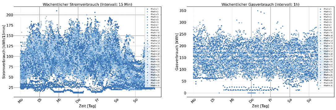 Neben dem elektrischen Lastprofil zeigt auch der wöchentliche Gasverbrauch eine klare Abhängigkeit vom Produktionsablauf. Es gibt eine konstante Grundlast, die hauptsächlich zur kontinuierlichen Wärmebereitstellung für Prozesspositionen (Elektrolyte, Reinigungsstufen) und Nebenaggregate benötigt wird. Je nach Auslastung, Prozessführung und Produktionsintensität variiert der Gasverbrauch von Woche zu Woche. Besonders der Wärmebedarf der galvanotechnischen Prozesse sowie der Vorbehandlungsstufen und die Raumbeheizung tragen wesentlich zum Gasverbrauch bei. Durch die Abluft werden große Mengen an Luft ausgetauscht, die gerade im Winter erneut aufgeheizt werden müssen, wodurch der Verbrauch durch die Raumbeheizung steigt. Zusätzlich führen unterschiedliche Produktionszyklen und die damit verbundenen Temperaturanforderungen in den Hallen zu weiteren Schwankungen des Heizbedarfs, was den Gasverbrauch weiter erhöht. Die gleichzeitige Betrachtung des elektrischen Lastprofils mit Grundlast und Lastspitzen sowie des wöchentlichen Gasverbrauchs ermöglicht die Bewertung von Maßnahmen zur Dekarbonisierung der Wärmeversorgung und zur Nutzung von Abwärme im Rahmen der Variantenanalyse.