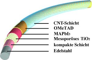 Ein feiner Stahldraht als Anode wird zunächst mit einer kompakten n-halbleitenden Titandioxidschicht überzogen. Darauf wird eine Schicht aus porösem nanokristallinen Titandioxid aufgetragen. Sie liefert eine große Oberfläche für die anschließende Abscheidung des Perowskit-Materials CH3NH3PbI3. Darauf kommt eine Schicht aus einem speziellen organischen Material. Abschließend wird eine transparente Schicht aus ausgerichteten Kohlenstoffnanoröhrchen kontinuierlich aufgewickelt, die als Kathode dient. Die resultierende Faser ist so fein und flexibel, dass sie sich zu Textilien weben lässt.