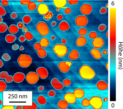 Die Abbildung zeigt die mit einem Rastertunnelmikroskop untersuchten Lanthan-Nanoinseln auf einer Wolfram-Unterlage / Bildquelle: Arbeitsgruppe von Prof. R. Wiesendanger, Universität Hamburg