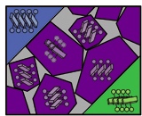 Sketch of organic semiconductor thin film shows that the interfacial region between larger domains (blue and green) consists of randomly oriented small, nano-crystalline domains (purple) / Image courtesy of Naomi Ginsberg / Berkeley Lab