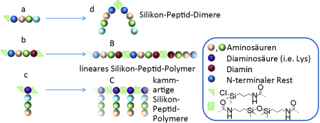 Silikon-Peptid-Copolymere vor.Die sehr einfache Synthese der Silikon-Peptid-Copolymere ist auf jede Peptidart anwendbar und liefert lineare oder verzweigte Polymerketten / Bildquelle: Wiley-VCH