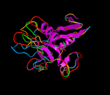 Perlucin weist charakteristische Proteinstränge auf, hier in einem BallView-Modell als bunte Schlaufen dargestellt. Vermutlich beeinflussen sie die Kristall-Struktur / Bildquelle: Copyright INM