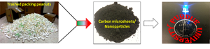 This schematic depicts a process for converting waste packing peanuts into high-performance carbon electrodes for rechargeable lithium-ion batteries that outperform conventional graphite electrodes, representing an environmentally friendly approach to reuse the waste / Source: Purdue University image/Vinodkumar Etacheri