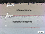 Im Packzementierverfahren beschichtete Probe (Stahl 1.4828) mit Ausmessung der Schichtdicke der Diffusions- und Interdiffusionszone / Bildquelle: Dechema