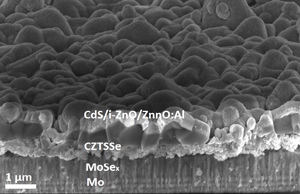 Querschnitt mit dem Rasterelektronenmikroskop: auf einem Mo-Substrat befindet sich die aufgedruckte Kesterit-Schicht (CZTSSe) / Bildquelle: HZB