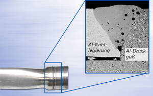 Wegen der hervorragenden Gießbarkeit und der Möglichkeit einer komplexen Formgebung wird Aluminiumdruckguss im Automobilbau vielfältig genutzt, insbesondere für dünnwandige Querschnitte. Häufig sind an den Gusskomponenten Schnittstellen zu Profil- oder Rohrhalbzeugen vorgesehen, welche meist druckdicht miteinander verbunden werden müssen. Dabei soll das Fügeverfahren möglichst effizient und kostengünstig sein. Strahlschweißverfahren sind prädestiniert für solche anspruchsvollen Verbindungen, insbesondere das Laserstrahlschweißen.